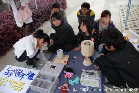 参加此次后备箱集市活动的是我院现代设计艺术系广告S2008-2班学生,他们利用课余时间,以保护环境为主题思想,利用筷子、扣子等废物设计制作了一批精美艺术品。希望通过参加这样的活动来体现当代大学生保护环境、珍惜环境、热爱环境的意识,同时希望能用自己的能力为玉树地震灾区筹备一笔捐款。活动结束时,同学们把“产品”卖得的所有资金作为善款捐给了玉树灾区。