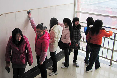 学生在教学楼清理污垢
