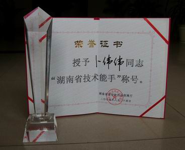 卜伟伟荣获加工中心操作第一名奖杯与“湖南省技术能手”证书