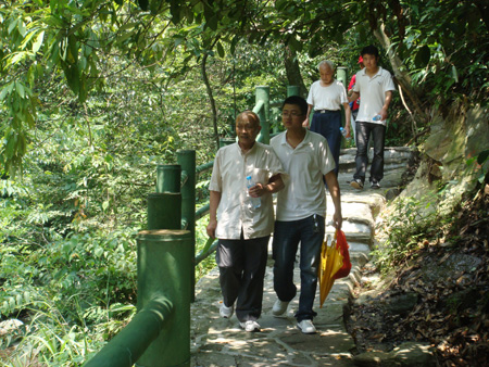 随后,老干部和学生代表们相继进行了自我介绍,同学们还表演了丰富多彩的文娱节目。在风景游览过程中,山高涧深的地貌给年龄较大的老干部行动带来了不便,学生代表们纷纷主动地去搀扶着老干部,有的撑伞,有的拿水,和谐、愉快的气氛伴随着整个活动始终。