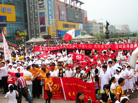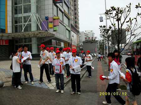 默哀仪式结束,机械系青年志愿者协会的会员在会长的组织下,来到长沙市黄兴路步行街进行了以“回首512,再助重灾区”的爱心义卖活动。本次爱心义卖活动得到了长沙晚报的大力支持,并且为本次活动赞助了1000份报纸,在这样一个特别的日子里爱心也传递到校园的每个角落,吸引了学院更多的同学加入到爱心义卖的队伍中来。
