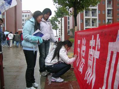 同学们积极在献血活动签名横幅上表达自己的爱心