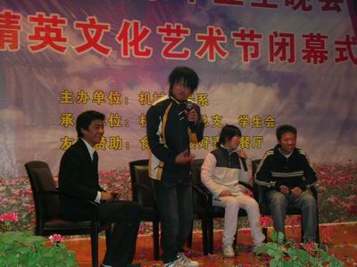 晚会以“毕业、颁奖、闭幕”为主题。胡正奎处长为晚会致辞。他说,在新年来临之际,机械系精英文化艺术节取得了圆满成功,这又为我院校园文化建设浓添一笔,他希望机械系能继续担任我院校园文化实践者的重任,在新的一年里开拓创新。他同时希望即将毕业的毕业生们要不忘“传播工院校园文化” 的使命,将我院文化植根于社会各地。毕业生代表张林春在发言时表示,作为一名毕业生,他将永记母校恩情,在今后的工作岗位上勤奋工作,力争为母校争光添彩。随后晚会精彩纷呈的节目更加带动了在场观众的热情,一首《感恩的心》让观众深受感动,申轶颖老师演唱的《美丽心情》振奋欢快,刘凯等毕业生代表表演的小品《追忆大学》赢得了观众的连连喝彩……。