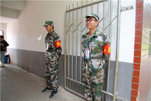 操场的跑道旁,站着一排身着迷彩服的“战士”。他们在清晨就已整装好在操场集合,比赛开始后便分布在赛场的各个执勤点工作,维持着赛场的秩序。来自计网2018-2班的钟生辉是保卫部的一名成员,他说:“作为学校保卫部的一份子,时刻记着自己肩上的责任,我们为自己能为校运会的成功举办出一份力而自豪。”
