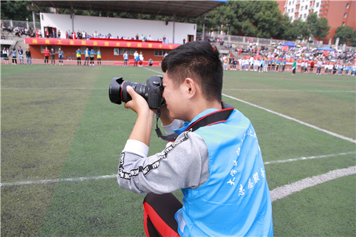 穿着天蓝色的小马甲的大学生记者团和工院之声广播站的同学们,他们奔走在操场的每一个角落,记录下每一个运动员挥洒汗水的瞬间,学生播音员解读比赛规则,宣读广播稿,传递胜利的信息,共同为此次校运会的完美呈现付出着。