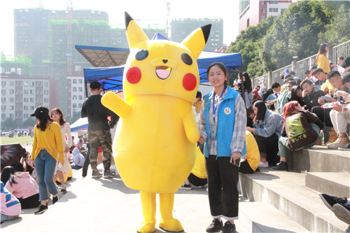 玩偶扮演让校运会氛围更加融洽,更具青春活力。电气自动化2018-1班的贺琨便是“比卡丘”的扮演者,活泼的他也参加了趣味运动赛的运转乾坤接力赛。