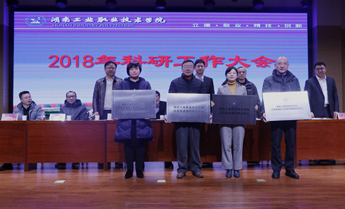 副校长邱丽芳宣读《科研发展中心建设方案》。现场举行授牌仪式,刘建湘为“科研发展中心”授牌,向罗生、党委副书记陈超、副校长邓建国、黄小东等校领导分别为“应用技术研究中心”“哲学社会科学及党建研究中心”“高等职业教育研究中心”“专家咨询委员会”授牌。