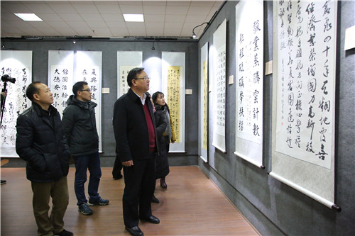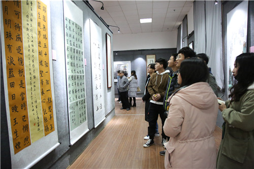 在场领导与师生们共同欣赏了现场展出的百余幅优秀书法、美术、摄影作品。观众们或驻足沉思、或拍照留念、或相互讨论。