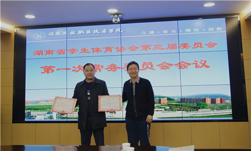 唐亚武向我校颁发省学生体育协会主席单位、主席聘书
