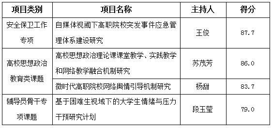 根据湘教工委通[2018]23号文件的通知,我校认真组织了此次课题申报工作。在校监察审计处的监督下,经专家评审,按打分情况排名,拟推荐我校“自媒体视阈下高职院校突发事件应急管理体系建设研究”等共4项课题申报2018年度全省高校思想政治工作研究课题申报,特此公示。