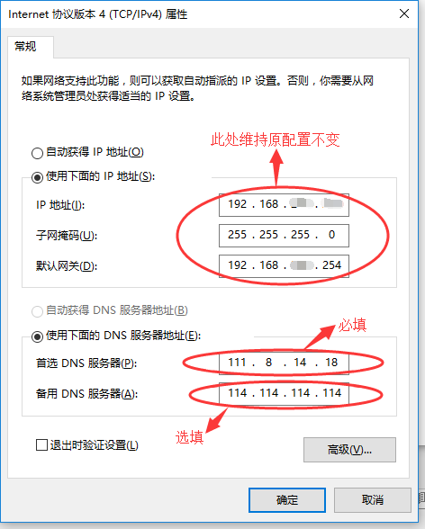 注意:必填项“首选DNS服务器”为:111.8.14.18,选填项“备选DNS服务器”为:114.114.114.114 。