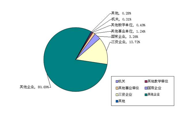 在已落实就业单位的3864人中,到事业单位就业48人,占1.24%;到企业单位就业612人,占80.69%;到其他教学单位就业的人数为19人,占就业人数的0.49%;国有企业就业人数为126人,占就业人数的3.26%;到三资企业就业的人数为530人,占就业人数的13.72%;到机关单位就业为12人,占0.31%。