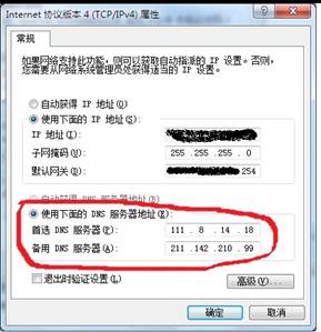 学院对第二实训楼(五教)互联网接入带宽扩容已经完成,由运营商的改变,需要将网络TCP/IP属性中的DNS服务器的IP地址进行变更(首选DNS服务器地址:111.8.14.18 (必填),备选DNS服务器地址:211.142.210.99 (可选)),原主机的IP地址、子网掩码、默认网关均不变,请参照图1所示进行修改。