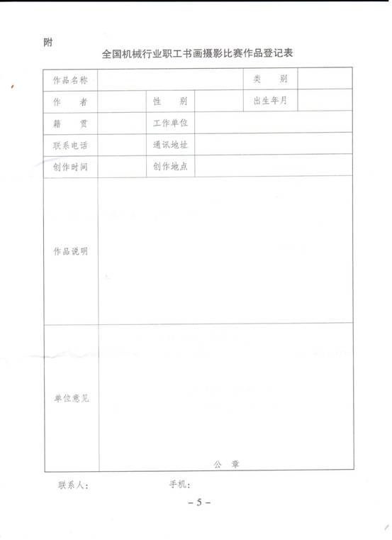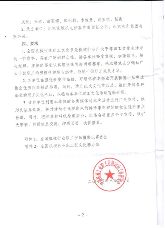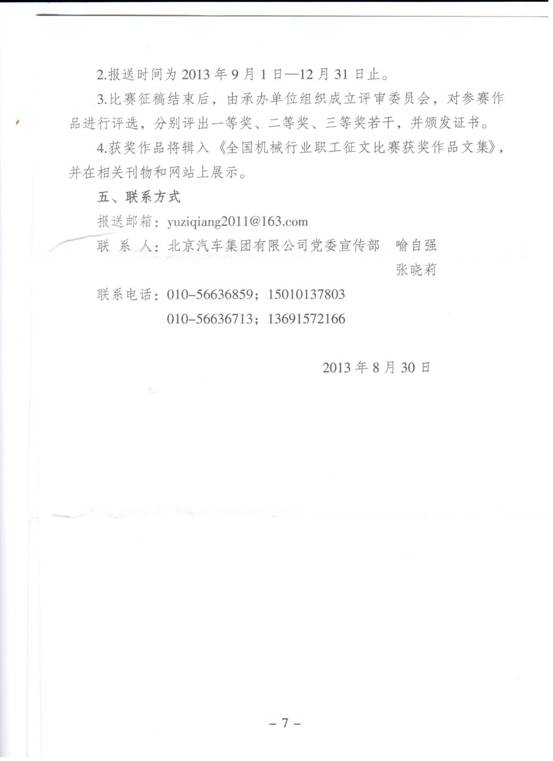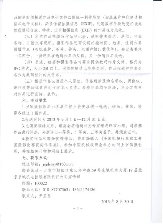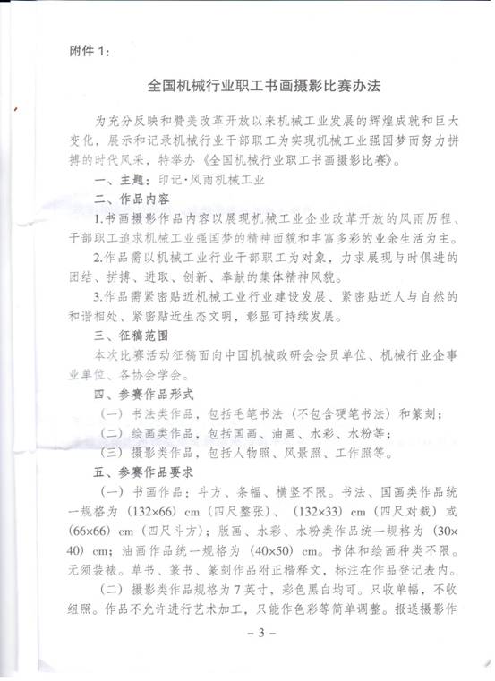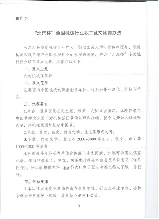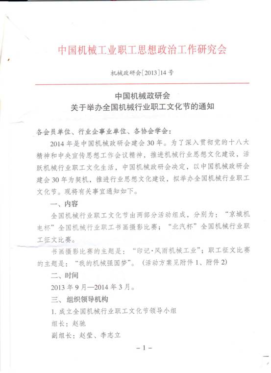 现将机械政研会【2013】14号文《中国机械政研会关于举办全国机械行业职工文化节的通知》转发给你们。请积极组织本部门的教职员工参加“京城机电杯”全国机械行业职工“印记·风雨机械工业”为主题的书画摄影比赛和“北汽杯”全国机械行业职工“我的机械强国梦”为主题的征文比赛。为选出高质量作品参赛,学院将组织预赛,预赛作品内容、形式、要求均按《中国机械政研会关于举办全国机械行业职工文化节的通知》的要求执行。请各总支、处室、系(院)将本部门的参赛作品(书画摄影作品每部门不少于2幅,征文作品不少于2篇)于2013年11月22前报院工会。