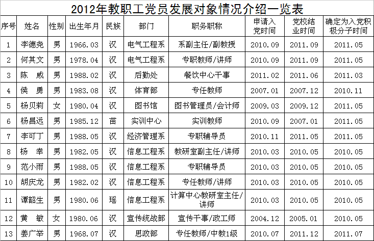 经党支部讨论,党总支审察,院党委初审,拟定李德尧等13名同志为发展对象。为确保发展党员工作质量,保持党组织的先进性和纯洁性,改善党员队伍的结构和分布,按照《党章》和《中国共产党发展党员工作细则(试行)》的有关规定,根据中共湖南省委组织部湘组发[2002]5号文件精神,现将李德尧等13名同志基本情况进行公示,如有异议,可与院组织部联系。(电话:82946120)