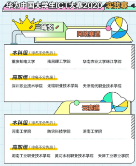 本网讯 近日,2020华为ICT大赛中传来好消息:由我校信息工程学院杨丽莎老师指导的计算机网络技术专业的胡淇、宁可慧、侯佳同学获得2020华为ICT大赛全球总决赛三等奖、中国赛区二等奖(全国高职组第二名),蒲骁旻老师指导的云技术与应用专业的邱海键、周超洋、黄有明获得2020华为ICT大赛全球总决赛二等奖、中国赛区三等奖(全国高职组第五名)。