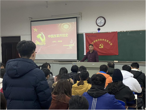 本网讯 12月28日,经济管理学院党总支学生党支部在1304教室开展中国改革开放史专题党课学习。本次党课由经济管理学院党总支书记李树德讲授,学生党支部全体师生党员、预备党员、积极分子参加党课学习,并邀请了思政部副教授向洪老师对党课进行点评。
