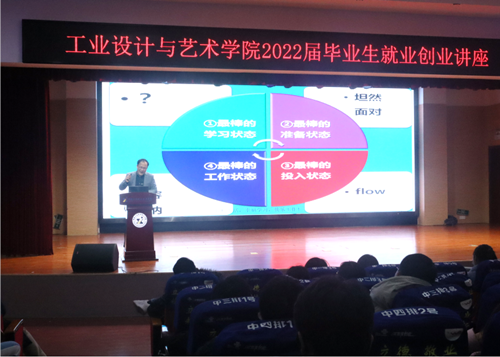 本网讯 1月7日下午,工业设计与艺术学院2022届毕业生就业创业专题讲座在1102大学生活动中心举行。国家级创业培训师、“黄炎培”职业教育创新创业大赛国赛评委、全国退役军人创业创新大赛评委吴轩辕教授以《驾驭自己,路在脚下》为主题进行了精彩演讲。工业设计与艺术学院、招生就业处相关负责人,学院全体辅导员及班主任,2022届毕业生代表现场聆听。讲座由工业设计与艺术学院党总支副书记郑志凌主持。