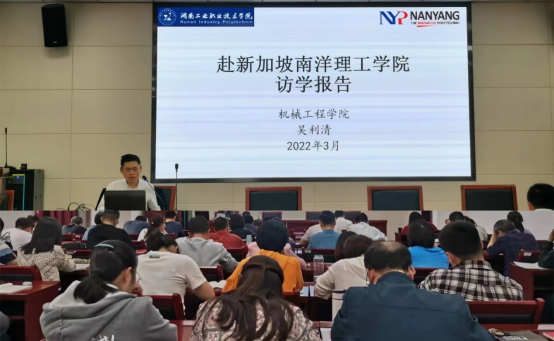 会上,机械工程学院吴利清教师就三个月在新加坡的交流见习情况进行了分享汇报。吴老师从新加坡高等职业教育体制、南洋理工学院办学特色、访学项目的具体实施过程、访学收获等方面进行了详细的汇报,并表示要将学到的知识、技术、管理理念等应用到实际工作当中,为学校的高质量发展做出贡献。