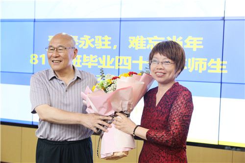 随后,校友们在行政楼二会议室举行了一场温馨的座谈会。“此次校友返校活动不仅增进了校友与母校之间的情谊,也为学校的发展注入了新的活力。”招生就业处处长王俊代表学校向校友们的归来表示热烈的欢迎,并向他们介绍了学校近期的发展情况和前景。8101铸造班原电子课老师、学校原副校长刘继平在座谈会上回忆了当时任课时场景。李希春校友代表8101铸造班向刘继平老师献上了鲜花,表达了对老师的敬意和感激之情。