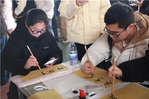 在德润心灵区的“抽签寄情”环节中,同学们随机抽取感恩纸条,完成致谢小任务,在校园里传递温暖与善意。智启心扉区的“惊蛰破局,巧解春锁”益智挑战烧脑有趣,限时2分钟拆解鲁班锁、九连环等器具,让同学们在动手动脑中锻炼专注力与耐心。体健心强区的“立春动春,投壶蹴鞠”趣味盎然,同学们按照规则顺利闯关打卡,在奔跑玩乐中舒展身心,结交新友。美育心灵区的“春分写心,墨语寄春”环节墨香袅袅,同学们写下春日心语,将作品张贴在创意墙上。劳励心智区的“谷雨播种,生命培育”活动备受欢迎,学生可现场领取种子、花盆及营养土,亲手播种后带回培育,后续通过线上群组分享植物生长情况,共同记录生命成长过程。