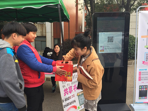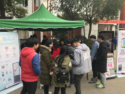 本网讯 “你们只需关注图书馆公众号,并下载相应APP,即可现场体验电子书借阅机为大家带来查询书目、下载电子书的便捷服务。”电子书借阅机校园推广活动上,一位志愿者向同学们介绍。