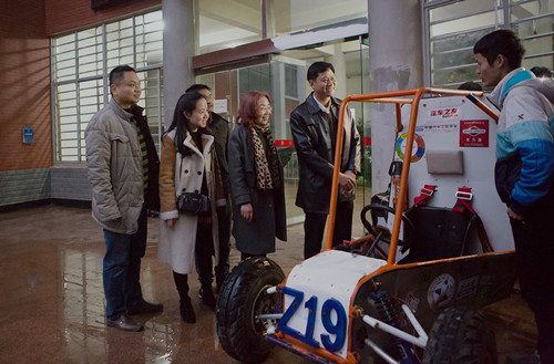 在这辆从图纸设计、车架焊接到整车装配全程由“蜂鸟车队”自主设计、自主研制的Z19号巴哈拉力赛全地形越野车前,向罗生就车队人员组成、赛车制造、车队发展近况等问题与车队队长及成员进行了深入的交流。向罗生对“蜂鸟车队”取得的成果表达了充分的赞赏,同时肯定了汽车工程学院在鼓励学生创新和科技竞赛方面做出的不懈努力和有益尝试。