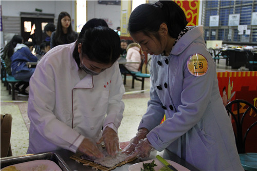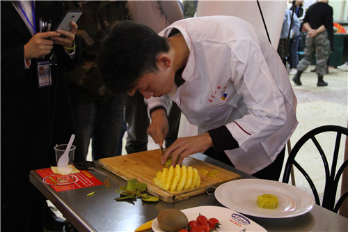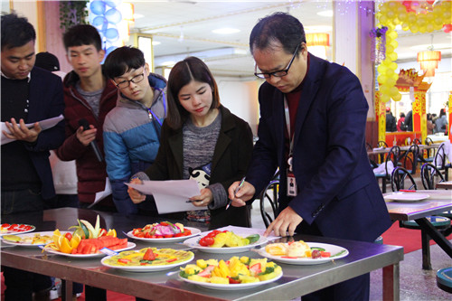 经过水果拼盘、寿司制作两个初赛项目后,最终决出了进入决赛的12只参赛队伍。决赛在下午两点准时举行,团委副书记李陟威、学校餐饮中心主任龙敏、湖南欧兰德餐饮管理有限公司董事长何志猛等相关负责人及部分学生干部担任现场评委。