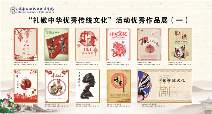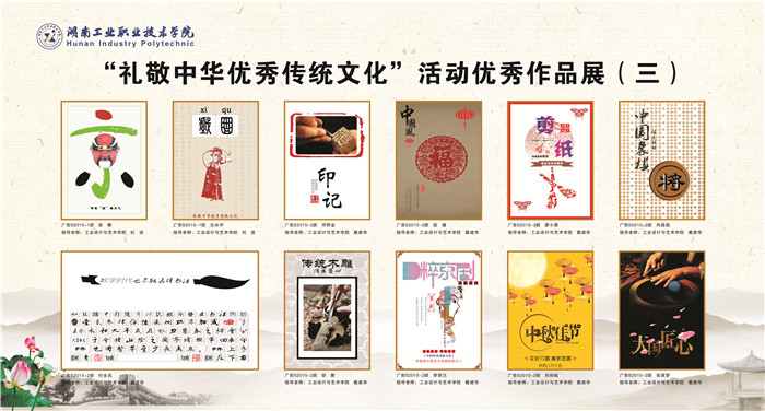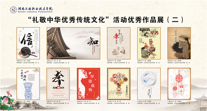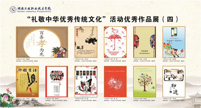 本网讯 9月29日,工业设计与艺术学院组织开展第四届“礼敬中华优秀传统文化”优秀作品评选活动。戴建华、杜进、张洁老师依据思想性、时效性、专业性等基本原则,对大学生设计的200余件作品进行了初选,评选出了45件优秀作品,在学校宣传栏进行了展示。