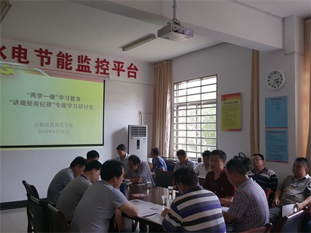 本网讯 6月28日下午,后勤直属党支部组织全体党员进行“两学一做”学习教育第二阶段“讲规矩、有纪律”专题研讨,支部书记苗治田主持会议,全体党员参加了专题研讨,联系后勤副院长张志勇全程参加并指导专题研讨。