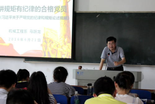 本网讯 6月21日下午,机械工程系党总支书记马跃龙就“做一名讲规矩、有纪律的合格党员”这一主题在2411教室讲党课。机械工程系党总支全体党员同志参加学习。