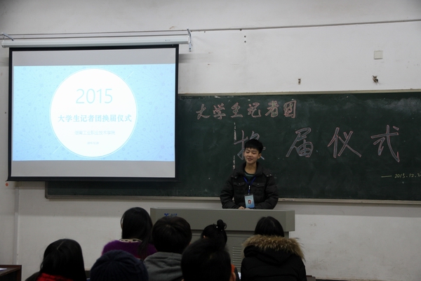 本网讯 12月29日,由院党委宣传部主办、院大学生记者团承办的2015年大学生记者团换届暨表彰大会在2105教室举行。大学生记者团指导老师及记者团全体成员参加大会,会议由记者团大一新成员甘胜莉、邹先波主持。