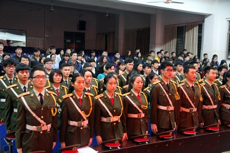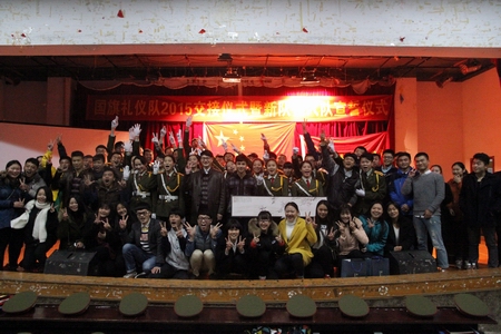 本网讯 12月10日,由院团委主办、院团委国旗礼仪队承办的2015年国旗礼仪队交接仪式在大学生活动中心举行。院团委副书记伍俊晖、院团委学生副书记钟彪、院团委各部门新老干部、国旗礼仪队在校全体成员等参加仪式。国旗礼仪队张聪担任主持人。