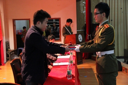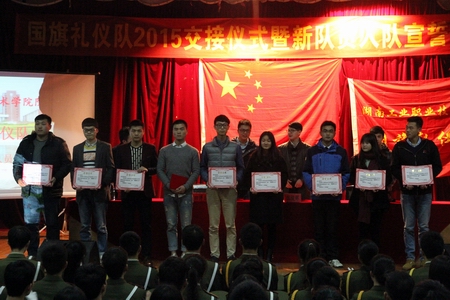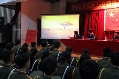 周健宏在就职感言中保证,自己将带领国旗礼仪队继续团结向上、永不言败;新队员代表杨丽则在发言时表示,新队员们将秉承国旗礼仪队“爱国旗、敬国旗、护国旗”的宗旨,积极主动承担各项任务,严格遵守训练纪律,严格执行、服从各项规章制度;钟彪宣读《关于院团委国旗礼仪队2013级队员的表彰决定》,授予2013级12位队员“国旗卫士”荣誉称号,领导嘉宾为老队员代表颁发荣誉证书及纪念品。
