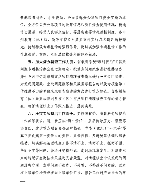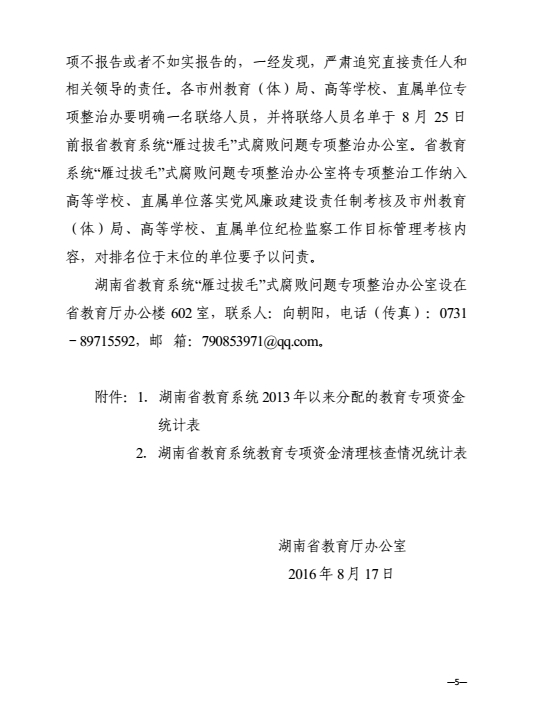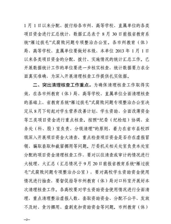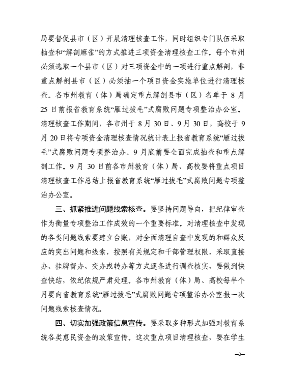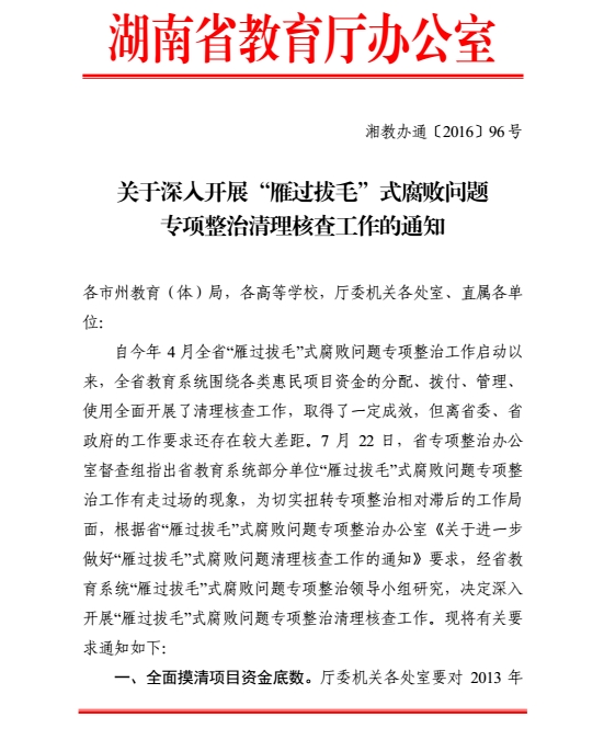 湖南省教育厅办公室关于深入开展“雁过拔毛”式腐败问题专项整治清理核查工作的通知
