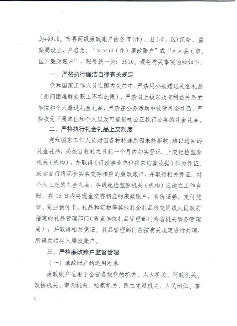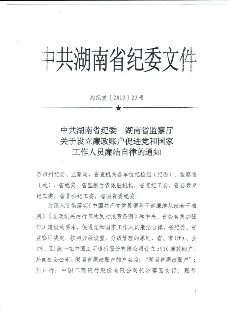 中共湖南省纪委 湖南省监察厅 关于设立廉政账户促进党和国家工作人员廉洁自律的通知