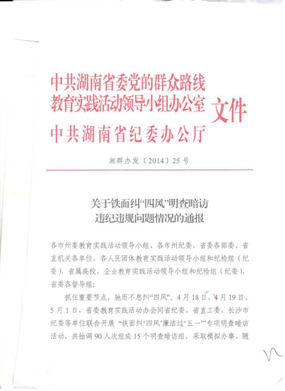 现将《铁面纠四风明查暗访违纪违规问题情况的通报》(湘群办发[2014]15号)、《湖南省纪委通报七起违反作风建设规定精神的典型问题》转发给你们。各系(院)、部门、实习工厂必须高度重视,认真组织学习,要求全体教职工严格贯彻落实中央八项规定,坚决做到令行禁止,正风肃纪,进一步推进作风建设,促进学院教育事业的发展。