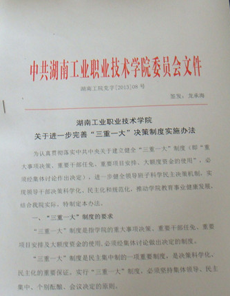 “三重一大”制度是民主集中制的一项重要制度,是决策科学化、民主化的重要保证。实行“三重一大”制度,必须坚持集体领导、民主集中、个别酝酿、会议决定的原则。