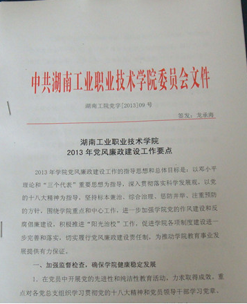 4、全面推进党风廉政建设责任制考核评价工作的落实。签订2013年党风廉政建设责任书;开展2013年度“落实党风廉政建设责任制,推进惩治和预防腐败体系建设”检查考核工作。