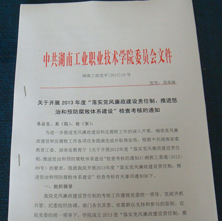 为进一步推进党风廉政建设和反腐败工作的深入开展,确保党风廉政建设和反腐败工作各项任务圆满完成并取得实效,根据中共湖南省委教育工委、湖南省教育厅《关于开展2012年度“落实党风廉政建设责任制,推进惩治和预防腐败体系建设”检查考核的通知》(湘教工委通〔2012〕99号)的要求,现就我院开展2013年度“落实党风廉政建设责任制,推进惩治和预防腐败体系建设”检查考核有关事项通知如下。