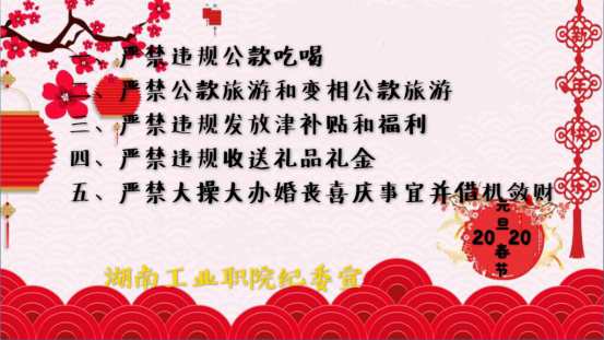 昨日已逝,新年将至,这是一个完美的结束,又是一个幸福的开始,在这辞旧迎新之际,湖南工业职院纪委祝福您:愿您乘着和煦的春风,朝着灿烂的明天,勇往直前!同时也给您奉上温馨提醒,请您谨记。