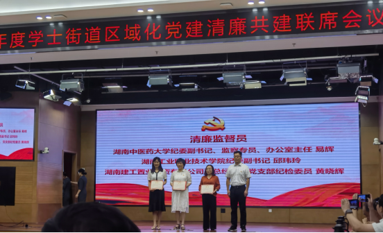 会上,我校等15家共建单位分别与学士街道工委相互认领了2023年度区域化党建+清廉共建项目书。电子pg游戏平台下载“志愿服务”项目获得了学士街道区域化党建+清廉共建2022年度“优秀共建项目”。我校纪委副书记、纪检监察处处长邱玮玲受聘为清廉监督员,并为其颁发了清廉监督员聘书。湖南湘江新区宣传工作部部长、岳麓区委常委、宣传部长刘雄辉做了讲话,对学士街道与15家单位携手共建表示赞同,要求学士街道与15家单位真正实现组织一线牵、全街一盘棋,党建带廉建、廉建促党建,打造区域发展共同体。