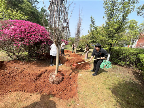 在同心花园内,党员们分工协作、默契配合,挥锹铲土、扶苗填坑、浇水培土,每一道工序都严谨细致。经过一个多小时的劳作,一株株紫玉兰树苗迎风挺立,枝头嫩芽初绽,与“不忘初心 牢记使命”展板交相辉映,为校园增添一抹生机盎然的“清廉绿”。