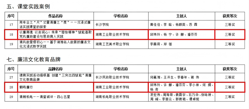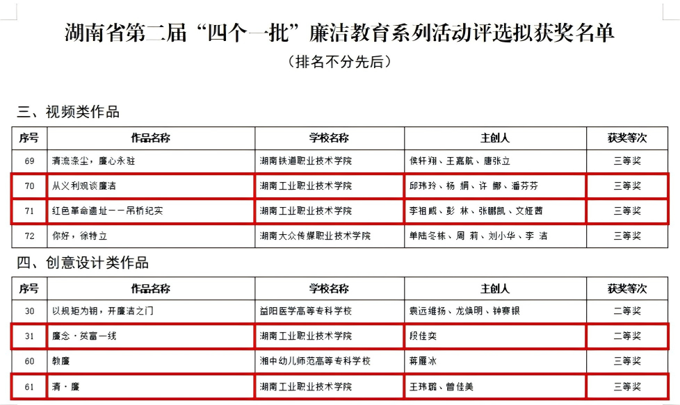 近日,湖南省教育厅公布了第二届“四个一批”廉洁教育系列活动评选结果,我校有多项作品获奖,涵盖视频、创意设计、课堂实践案例和廉洁文化教育品牌五个领域,其中视频类作品三等奖2项,创意设计类作品二等奖1项、三等奖1项,课堂实践案例三等奖1项,廉洁文化教育品牌三等奖1项。