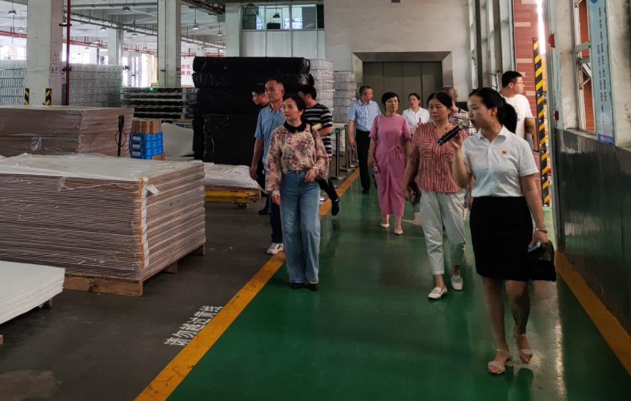 谢希钢一行首先参观了晚安床垫智能制造车间及晚安家居产品研发与检测中心。谢希钢副校长形象地用三个颜色形容晚安:粉色的樱花文化园、红色的企业文化、绿色的环保家居产品,以此表达对晚安的欣赏与认可。