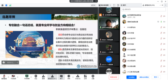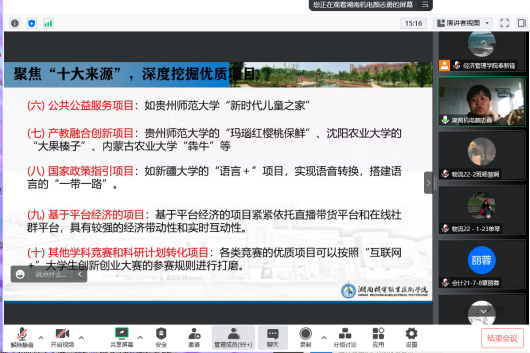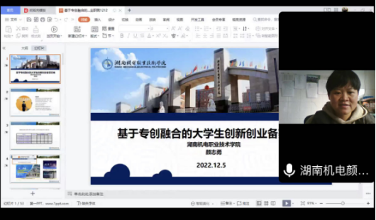创新创业教育是大学生素质教育的重要内容,也是大学生顺利就业、走向社会的关键环节。为进一步营造大学生创新创业的良好环境,培养大学生的创新创业意识,经济管理学院于12月13日邀请湖南机电职业技术学院智造创客学院院长颜志勇副教授通过线上方式为我院全体学生召开“基于专创融合的大学生创新创业备赛攻略”的专题讲座。