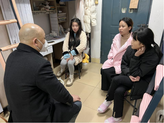 走访过程中,杨学文深入了解同学们假期的学习生活情况,向学生分享自己的学习经验和寒假学习成果,身体力行的诠释了“学无止境,行以致远”的道理,希望同学们在新的学期努力学习专业知识,熟练掌握专业技能,扩展自身的兴趣爱好,实现德智体美劳全面发展。同时,也鼓励同学们要志存高远,不断磨砺与提升自我。周敏与学生亲切交流返校过程、居家在线及返校后的学习情况,提醒学生做好宿舍安全、卫生、消毒、通风等事宜。辅导员及班主任叮嘱同学们要提高疾病预防意识,做好一日三检,加强锻炼,养成良好生活习惯,保持积极乐观的心态面对生活、学习、就业、升学。