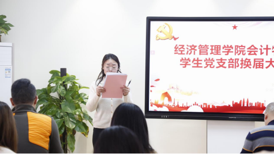 接着,支部全体正式党员审议通过了《经济管理学院大数据与会计学生党支部委员会选举办法》,表决选举贺格同志为总监票人,罗淞元同志为监票人,王崇阳同志为计票人。随后,盛娜逐一介绍了大数据与会计学生党支部候选人的基本情况。全体党员采用差额选举、无记名投票的方式,选举产生了新一届支部委员。
