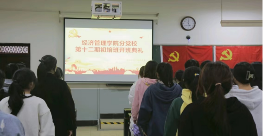 2023年3月7日下午,经济管理学院分党校第十二期初培班开班典礼在尚善楼1204开幕。经济管理学院党总支书记杨学文、党总支副书记周敏、党务办公室主任段玉莹,学工办主任盛娜、团学指导老师纪文婷、全体辅导员以及全体申请入党同学参加开班典礼。