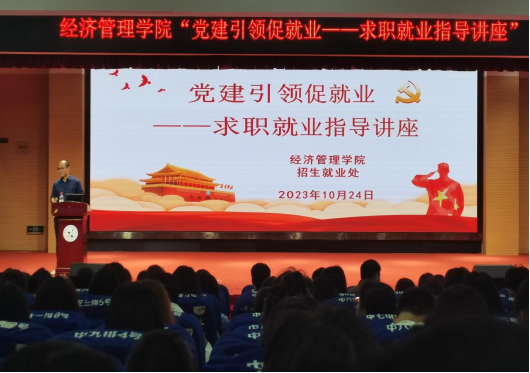 为更好促进2024届毕业生高质量就业,帮助学生了解当前的就业形势、就业政策,转变就业观念,提高就业技能,2023年10月24日18时,经济管理学院联合招生就业处在尚善楼1102开展了求职就业指导讲座,邀请优秀校友、资深企业管理咨询顾问谷任明作为主讲嘉宾。经济管理学院2024届毕业生以及全体学生党员参加此次活动,经济管理学院党总支副书记周敏出席讲座,讲座由奉新锋老师主持。